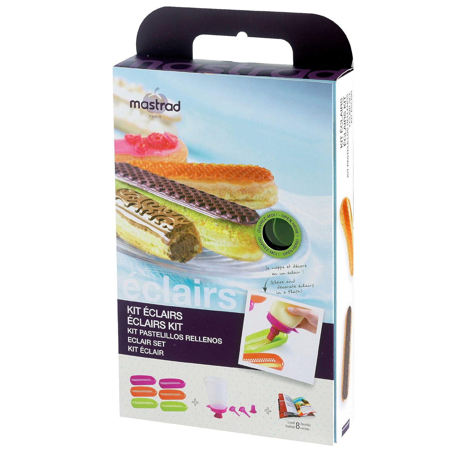 6" L x 1.4' W x 1.6" D Mastrad 8-Piece Éclair Kit is best for youMastrad® 8-Piece Éclair Kit Bake delicious éclairs every time with the Mastrad Éclair Kit. It comes with 6 colorful silicone molds that can be used to bake, fill, and glaze éclairs, a Deco pocket to help fill the molds and a recipe booklet with tips and recipes. With the Mastrad Éclair Kit, you can bake delicious éclairs every time Set includes: 6 molds 1 deco pocket 1 recipe booklet Dishwasher safe Each éclair mold measures 6' L x 1.4' W x 1.6' D Imported SKU # 44496968