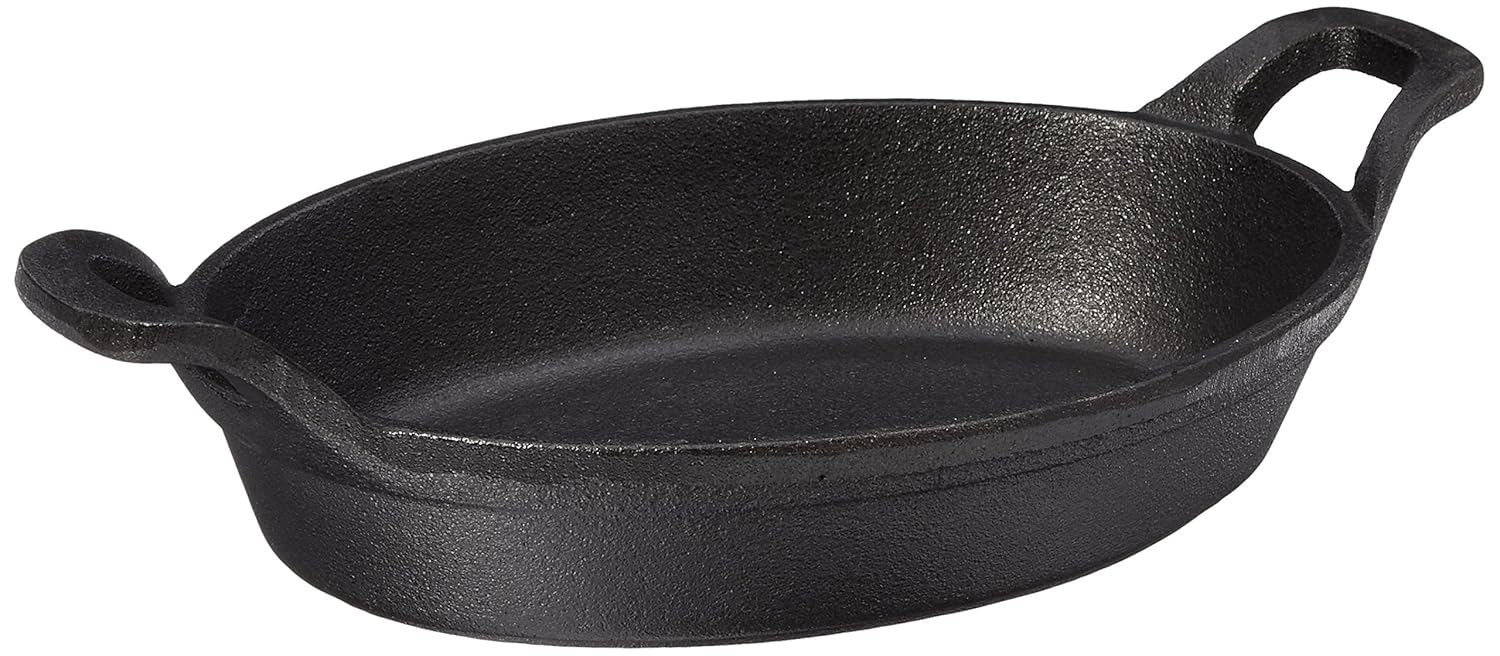 a wonderful assortment of popular essentials. The collection includes two 9-inch round cake pans, a 10x13-inch cake pan, a 4.5x8-inch medium loaf pan, a 10x14-inch muffin pan (12 cups), and a 10x14.5-inch cookie sheet. From cinnamon rolls to birthday cake to chocolate-chip cookies on a rainy Sunday afternoon, the bakeware set will surely inspire and delight any baking enthusiast--avid or novice alike. Thanks to its heavy-weight, carbon-steel construction, the bakeware reliably resists warping and heats evenly throughout, so there’s no hot spots to worry about, which can burn baked goods. The bakeware consistently delivers beautifully browned results and can be trusted with all your favorite recipes.the American Metalcraft CIPOV856 Cast Iron Oval Casseroles and Pots, 10.875" Length x 6.125" Width, Black Thoughtfully designed inside and out, the carbon-steel bakeware set features a nonstick coating, which reduces the need for excess butter or oil in the pan and helps to ensure effortless food removal. Flip the pan to successfully transfer breads and cakes to a cooling rack and lift sugar cookies or sweet rolls gracefully with a simple slide of the spatula.At the end of a baking frenzy, you won't be stuck with serious scrubbing or messy overnight soaking. The AmazonBasics nonstick bakeware set cleans up quickly and easily--simply give it a rinse and place in the dishwasher.clear glass storage dishes feature secure-fitting blue lid to keep your stored foods fresh. Two dishes are included in this set.American Metalcraft CIPOV856 Cast Iron Oval Casseroles and Pots, 10.875" Length x 6.125" Width, Black is best for you24.8 Oz. Oval Casserole 8-1/2' L X 6' W X 1-3/4' H.