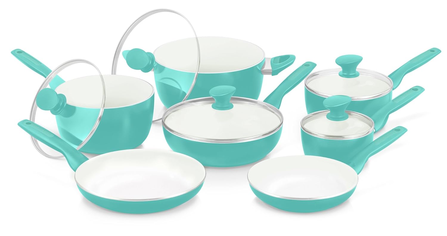 • The GreenPan Rio 12pc Ceramic Non-Stick Cookware Set, Turquoise is a