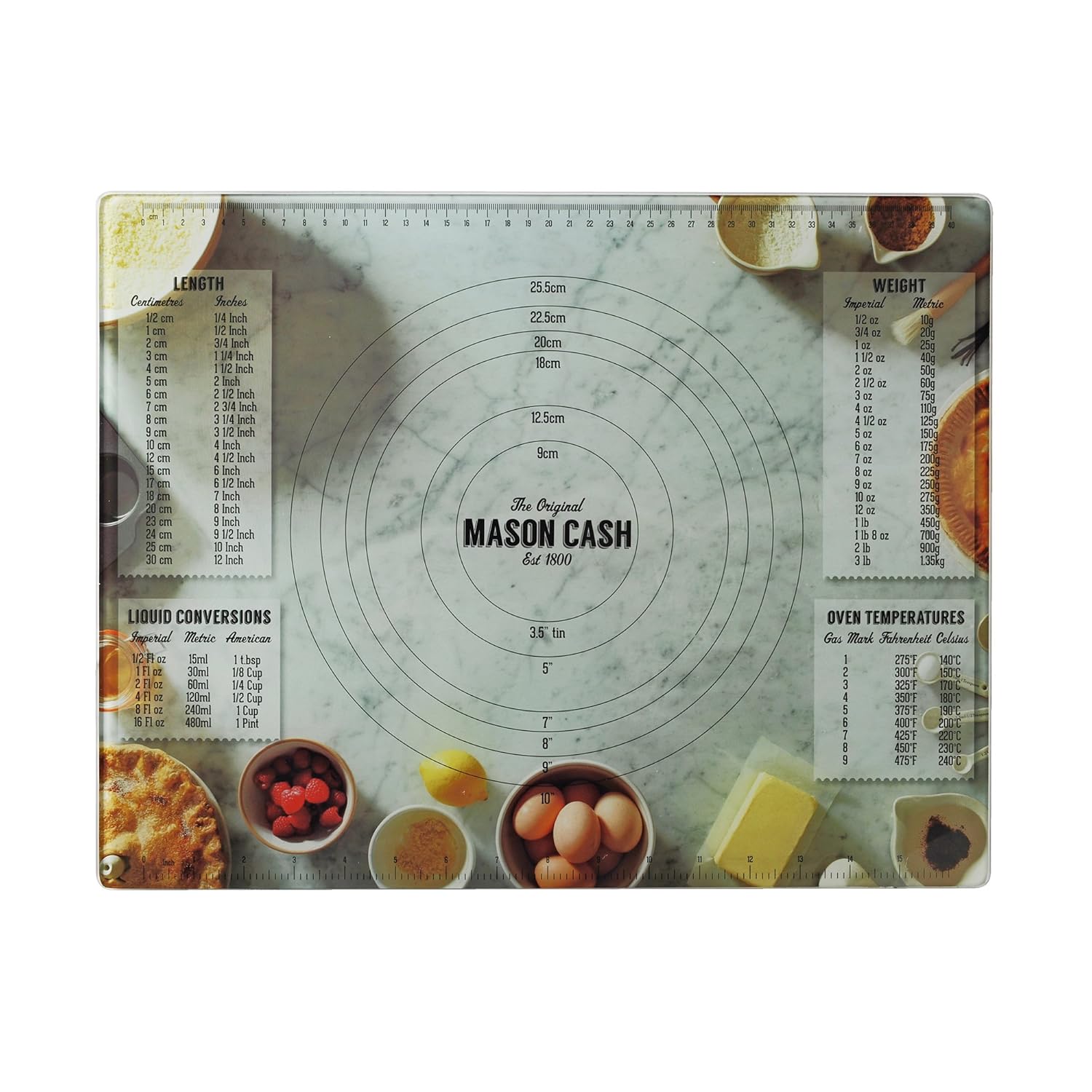 a wonderful assortment of popular essentials. The collection includes two 9-inch round cake pans, a 10x13-inch cake pan, a 4.5x8-inch medium loaf pan, a 10x14-inch muffin pan (12 cups), and a 10x14.5-inch cookie sheet. From cinnamon rolls to birthday cake to chocolate-chip cookies on a rainy Sunday afternoon, the bakeware set will surely inspire and delight any baking enthusiast--avid or novice alike. Thanks to its heavy-weight, carbon-steel construction, the bakeware reliably resists warping and heats evenly throughout, so there’s no hot spots to worry about, which can burn baked goods. The bakeware consistently delivers beautifully browned results and can be trusted with all your favorite recipes.the Mason Cash Baker Lane Glass Pastry Board, 14-1/6 Inches Thoughtfully designed inside and out, the carbon-steel bakeware set features a nonstick coating, which reduces the need for excess butter or oil in the pan and helps to ensure effortless food removal. Flip the pan to successfully transfer breads and cakes to a cooling rack and lift sugar cookies or sweet rolls gracefully with a simple slide of the spatula.At the end of a baking frenzy, you won't be stuck with serious scrubbing or messy overnight soaking. The AmazonBasics nonstick bakeware set cleans up quickly and easily--simply give it a rinse and place in the dishwasher.clear glass storage dishes feature secure-fitting blue lid to keep your stored foods fresh. Two dishes are included in this set.Mason Cash Baker Lane Glass Pastry Board, 14-1/6 Inches is best for youMason Cash--the choice of home cooks and bakers for centuries. The Mason Cash Baker Lane line brings a sense of nostalgia to your kitchen. The ultimate tool for any baker, this glass pastry board makes it easy to roll and lift pastry dough, while providing various measurements and American and metric conversions to make baking easier than ever before. The board features pie size patterns and classic recipes with non-slip feet on the base. Wipe clean with a damp cloth for proper care; Measures 18-1/9 by 14-1/6 inches. Mason Cash has been producing beautiful, functional, iconic kitchenware for over 200 years. The origins of Mason Cash can be traced back to a pottery operating at Church Gresley in the heart of England during the1800's. Famed for classic kitchenware designs such as the Mason Cash mixing and pudding bowls, the products and brand have endured the test of time and have become design classics, with some maintaining their original designs.